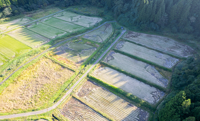 山間に入ると、あちこちに田んぼが見え始める。棚田米の産地としても知られる奥能登。近年の農地減少への危機感と、棚田のある風景を守ろうという思いから、特別栽培米注釈の「能登棚田米」に取り組む農家も多い地域だ。