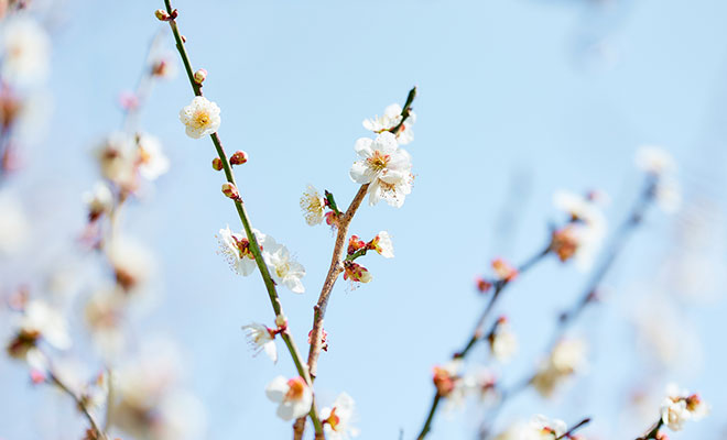 今井真実(以下、今井) うわあ、めっちゃきれい! 梅の花がいっぱい咲いてて、これはもうお花見ですねえ。