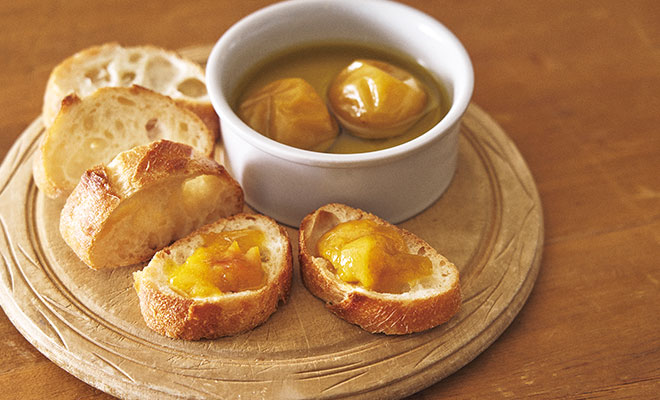 梅を塩とオイルで漬け込んだ「梅のオイル漬け」。果肉を崩してオイルごとバゲットにのせれば、ちょっとしたおつまみに(写真=今井裕治)