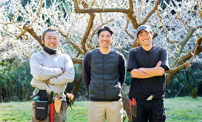長谷川さんとともに梅の栽培を行う、ジョイファーム小田原の根尾さん(左)、川本凱土さん(右)(写真=写真工房坂本)